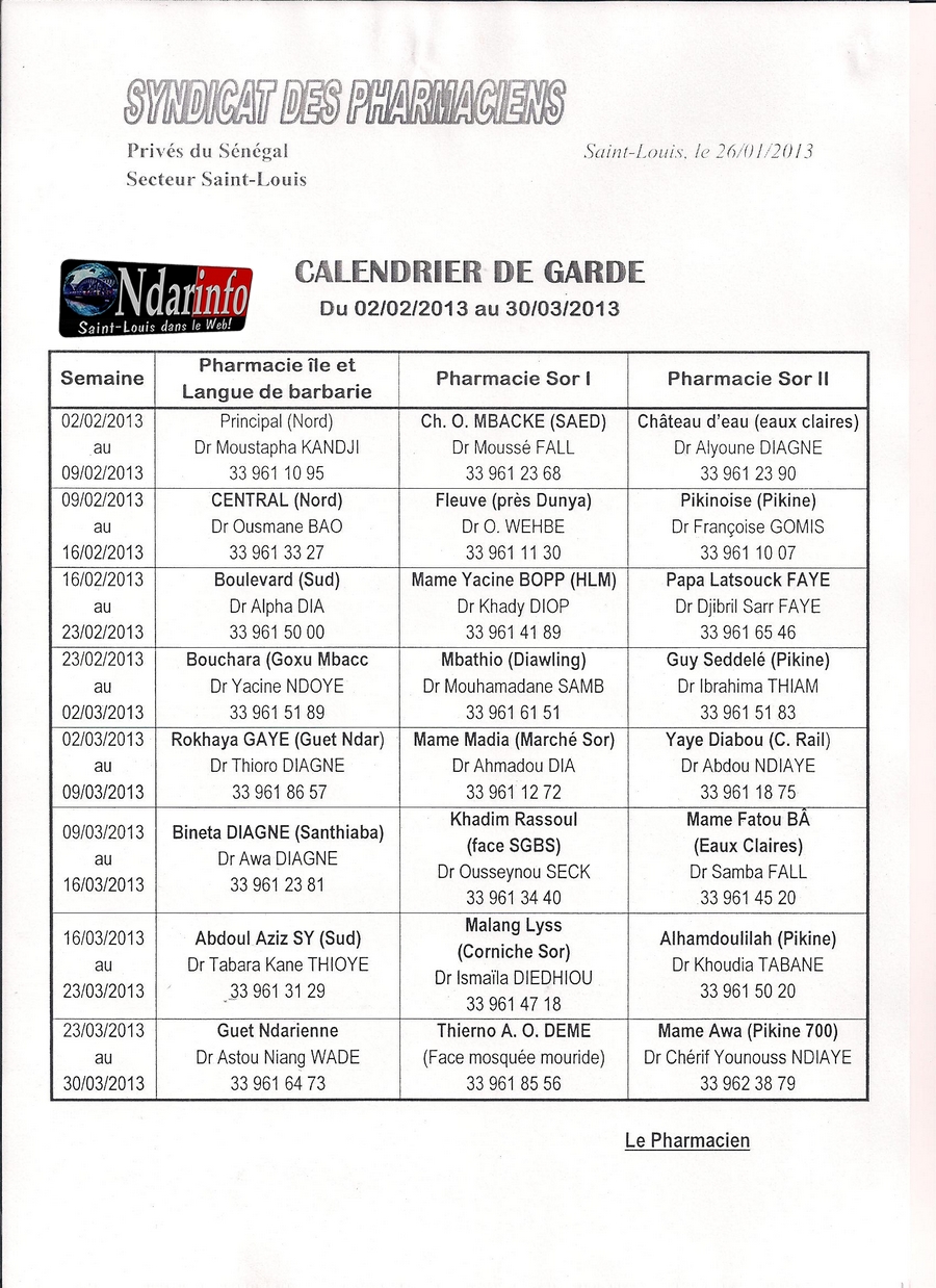 Calendrier des pharmacies de Garde du 02 février au 30 mars 2013.